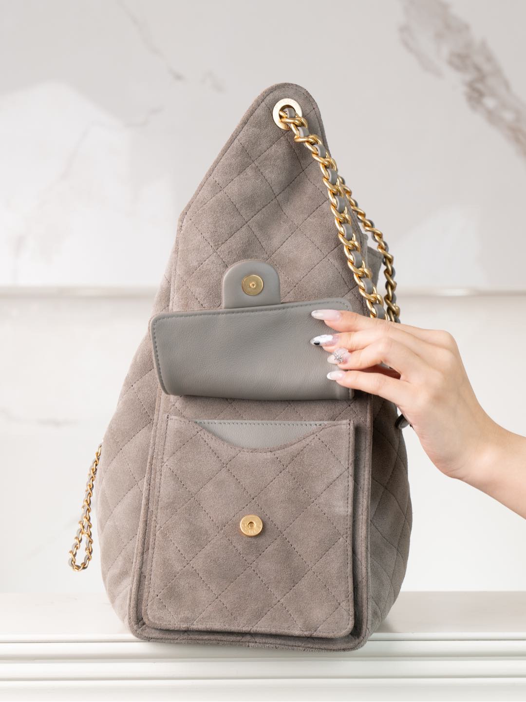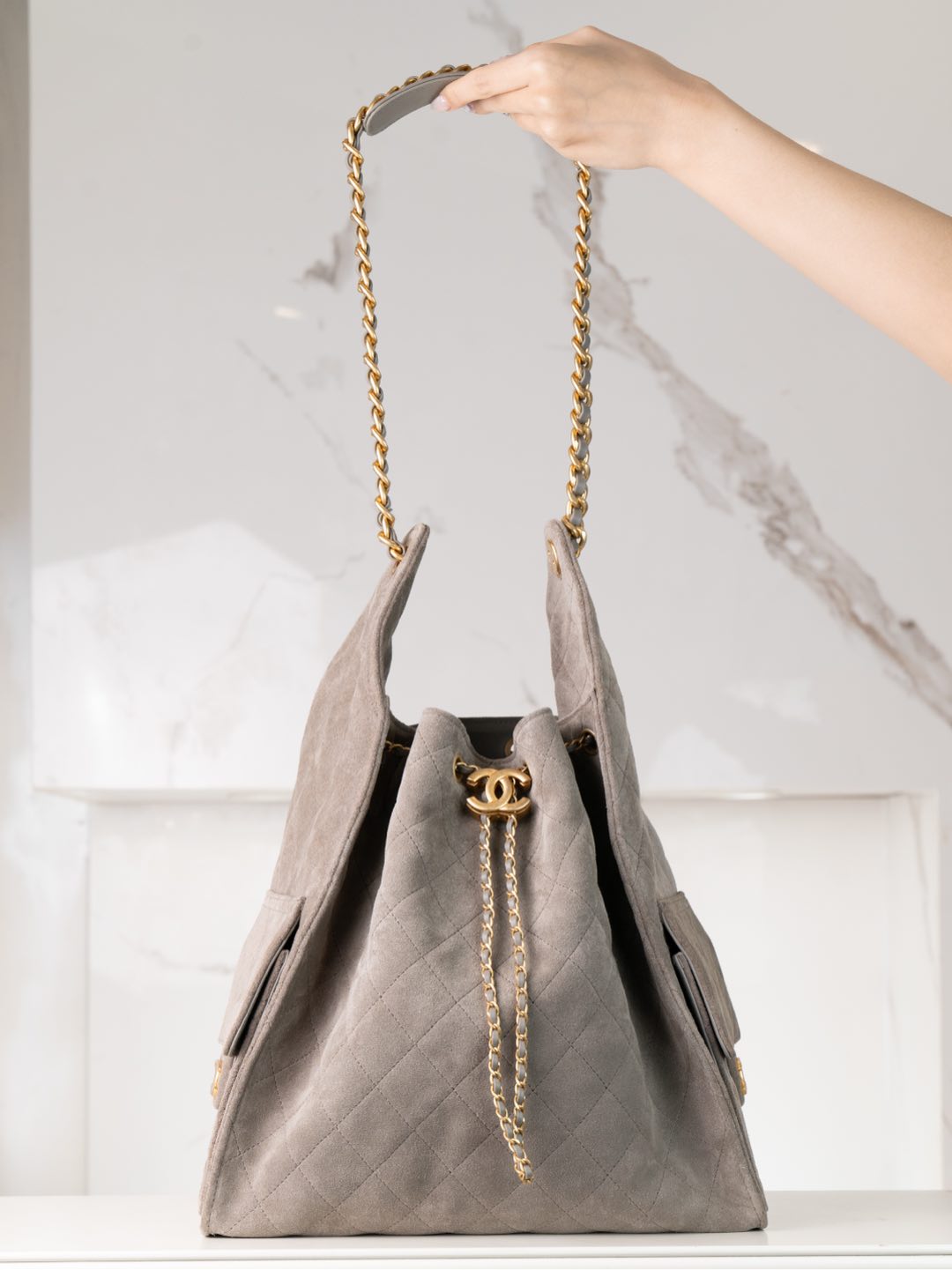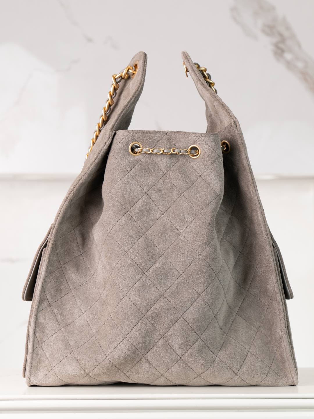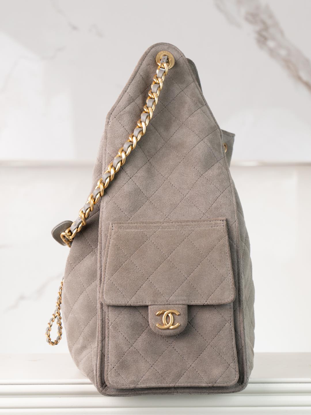 퀼팅 스웨이드 체인 드로스트링 백팩
