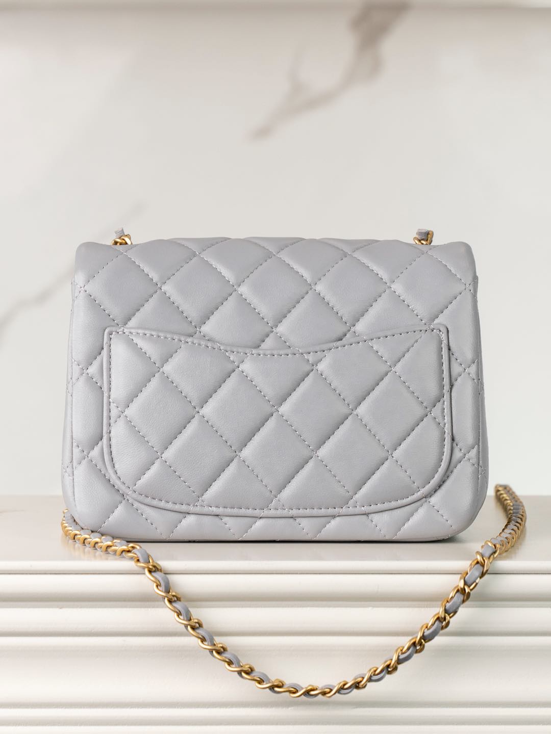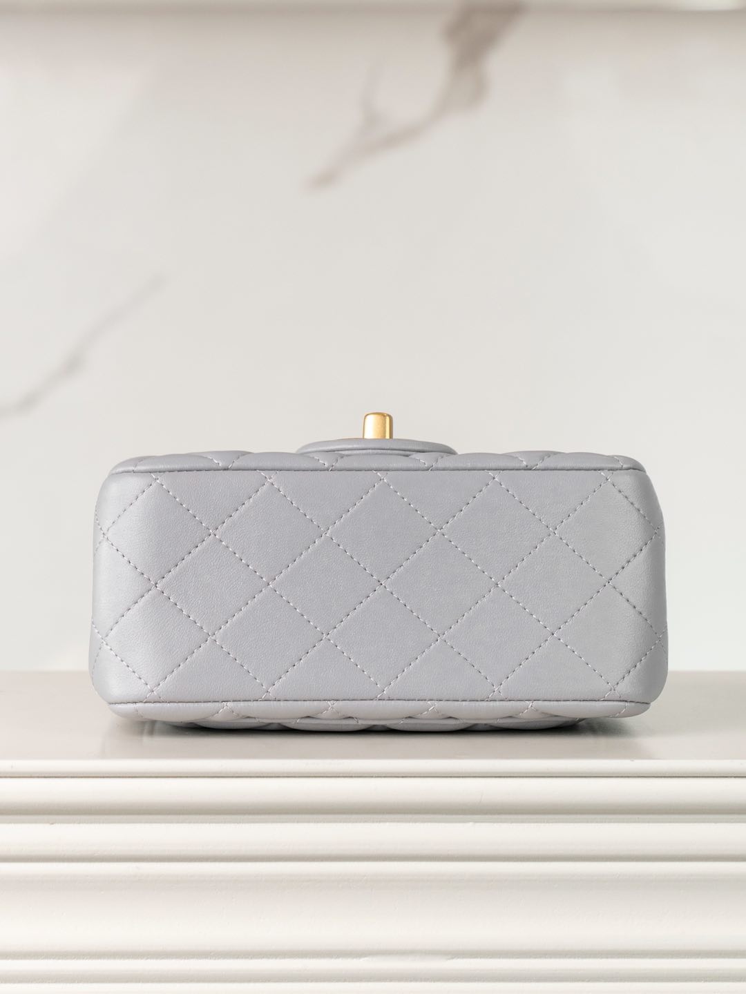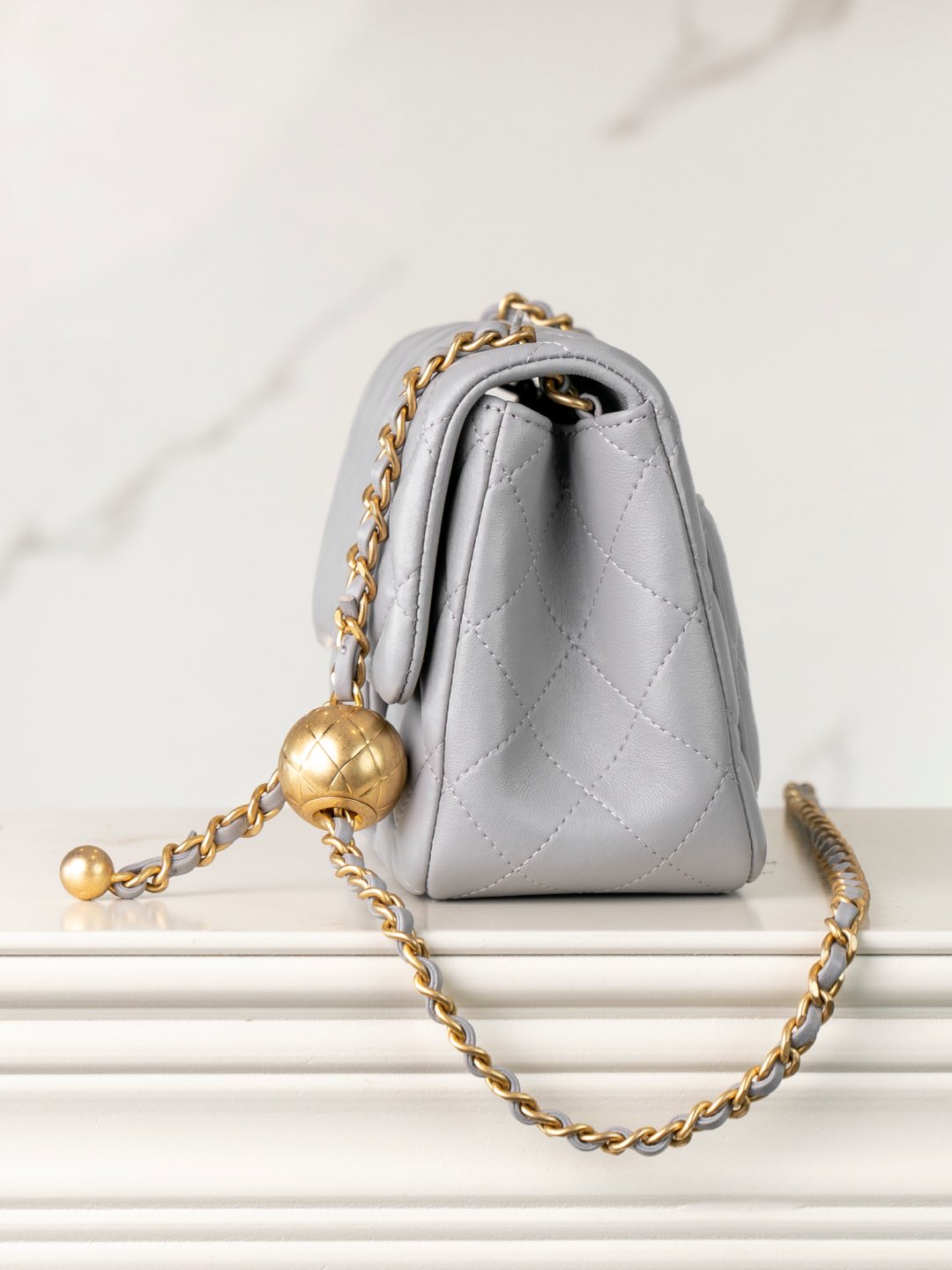 샤넬 클래식 미니 플랩백 램스킨 골드 메탈 볼 참 디테일 라이트 그레이