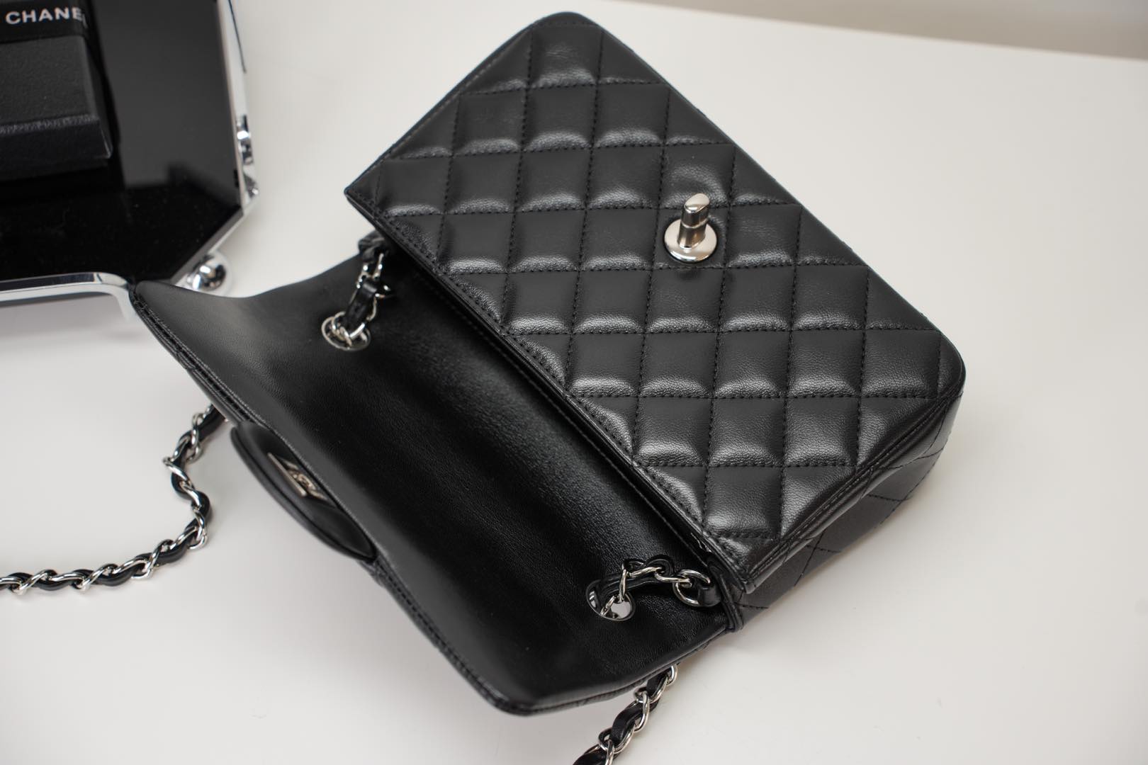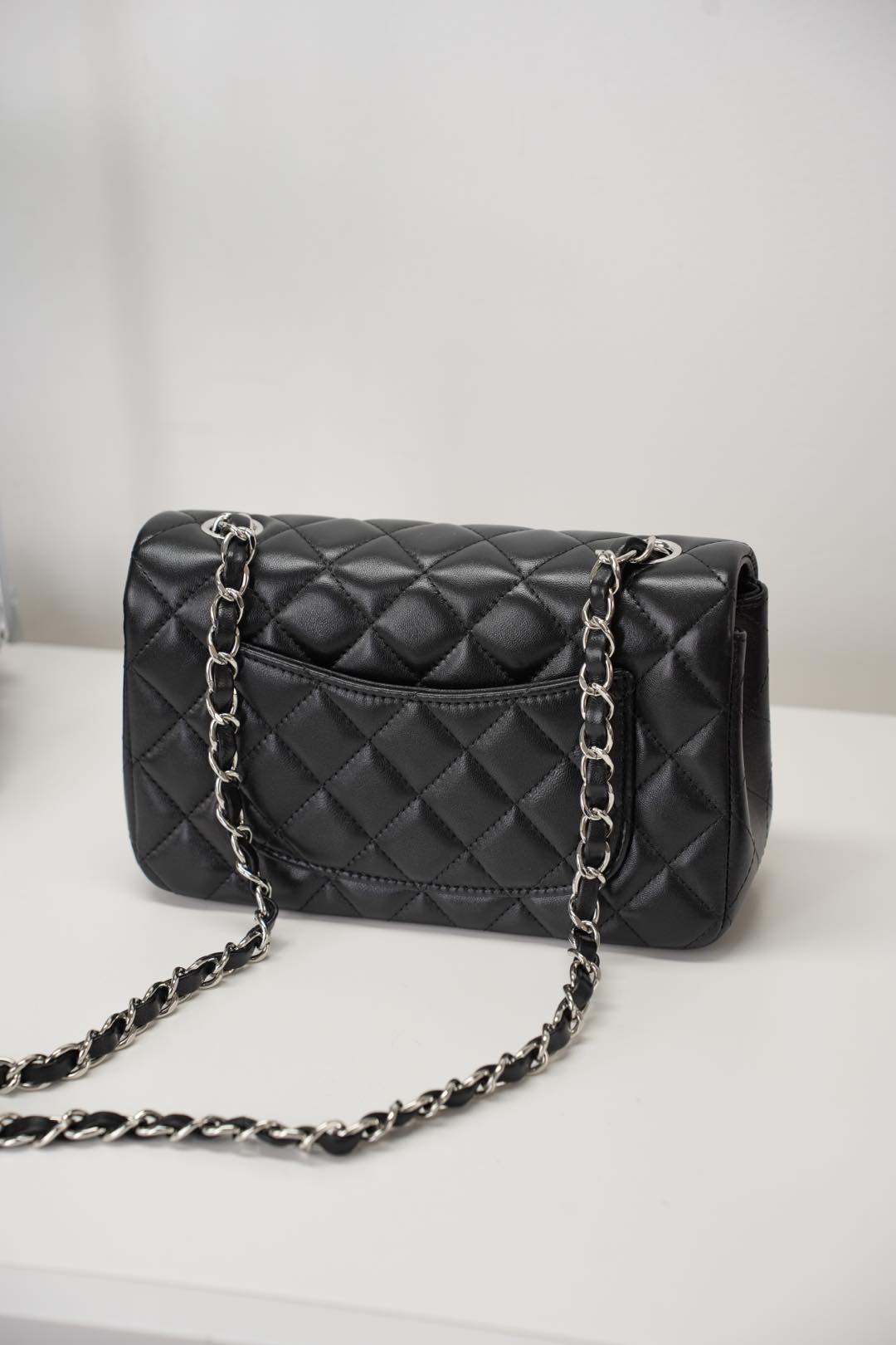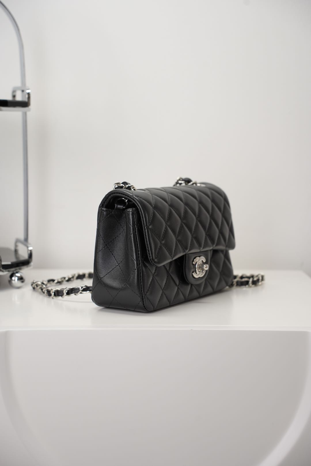 샤넬 클래식 미니 플랩백 램스킨 실버 메탈 블랙