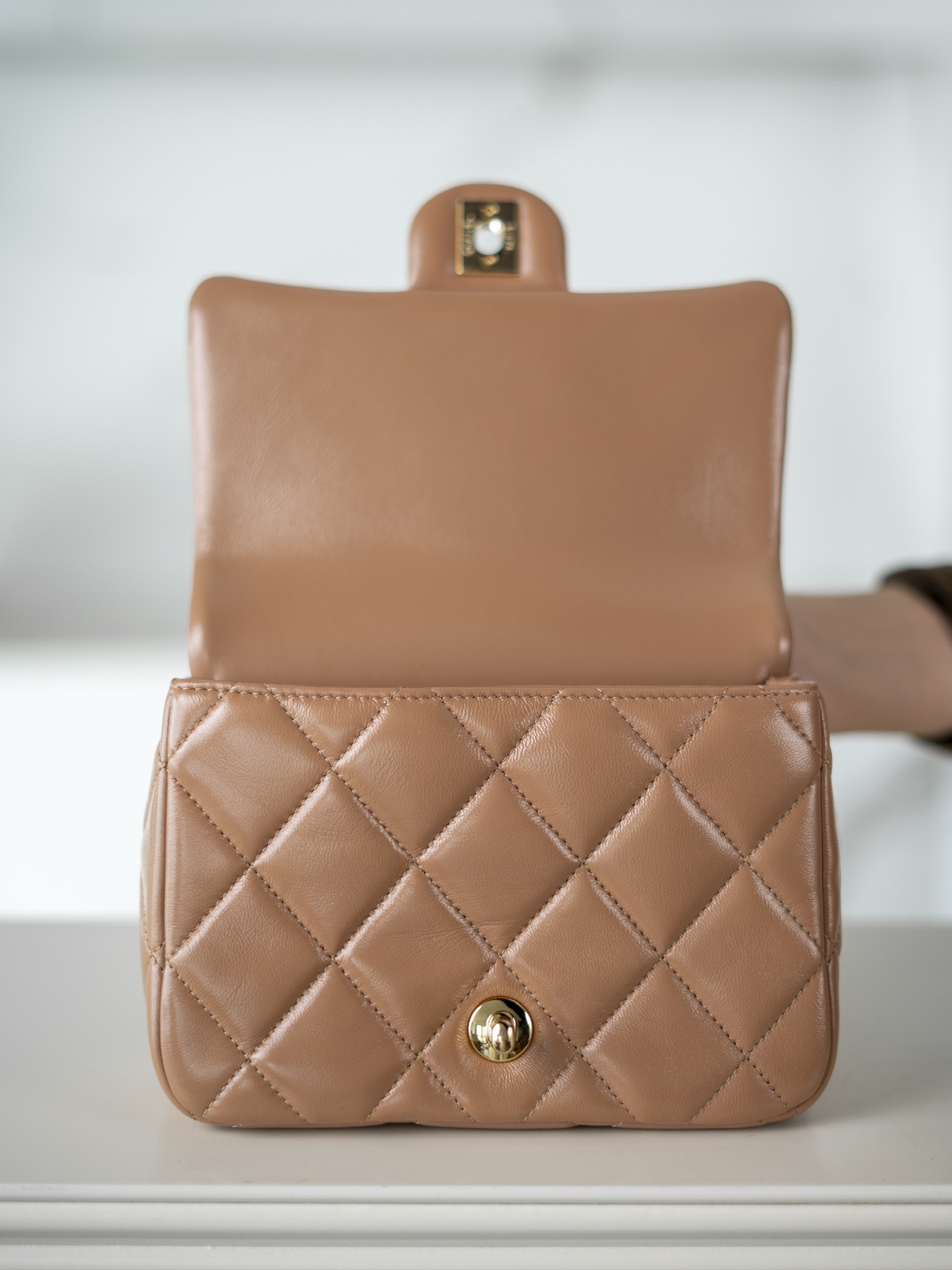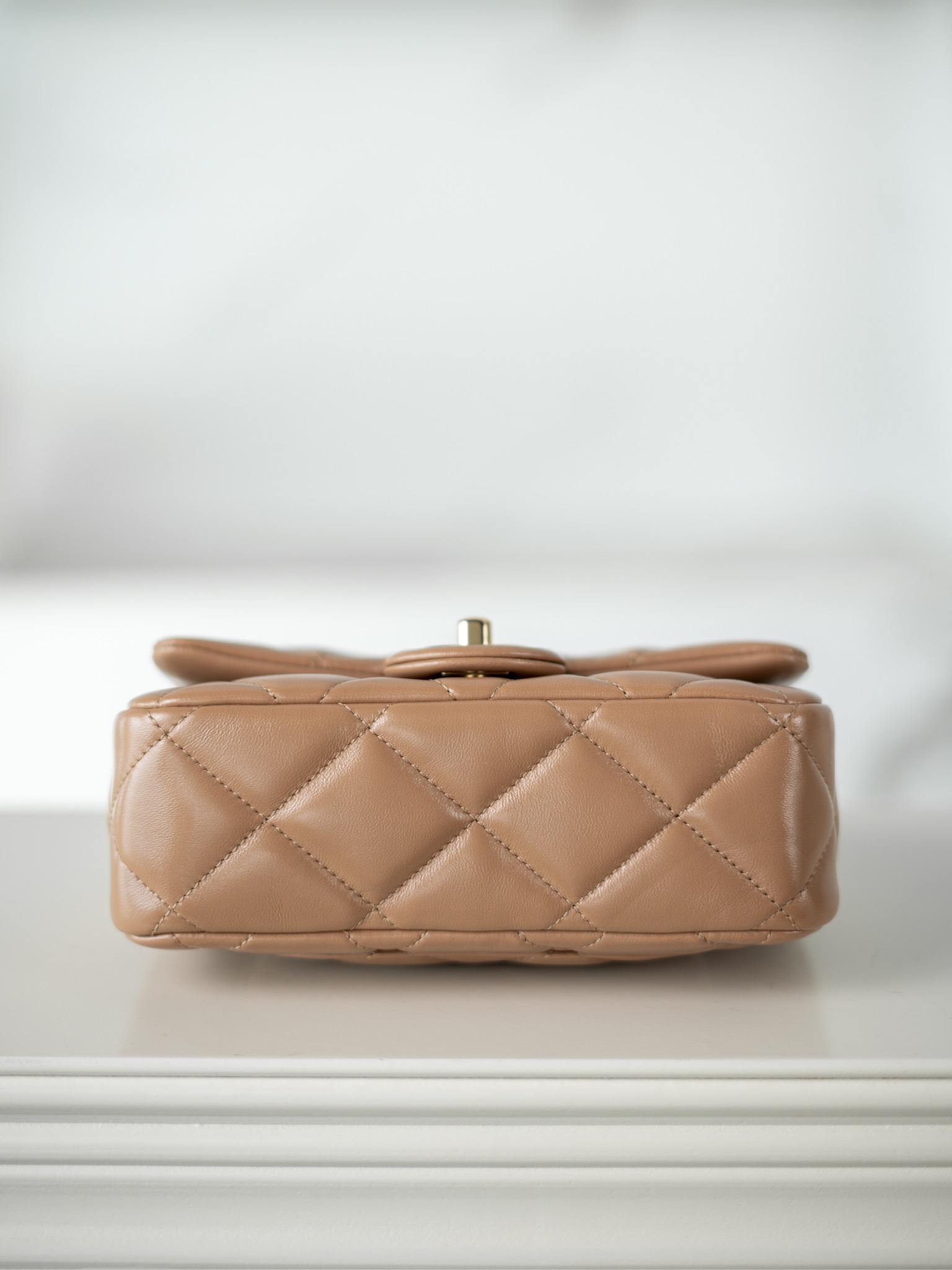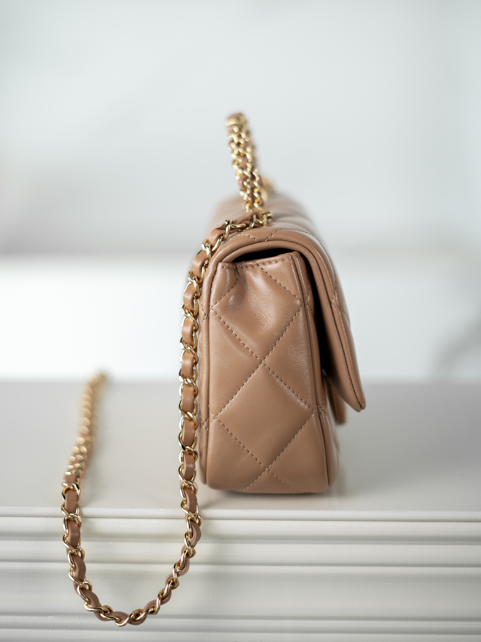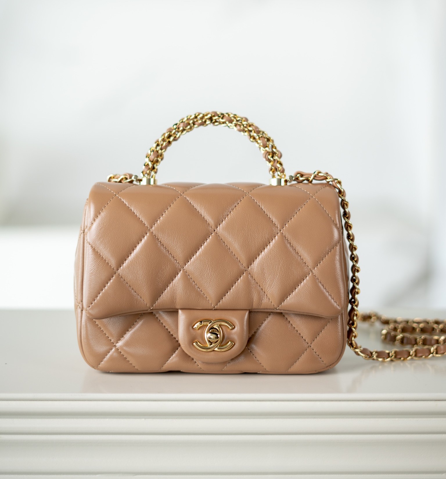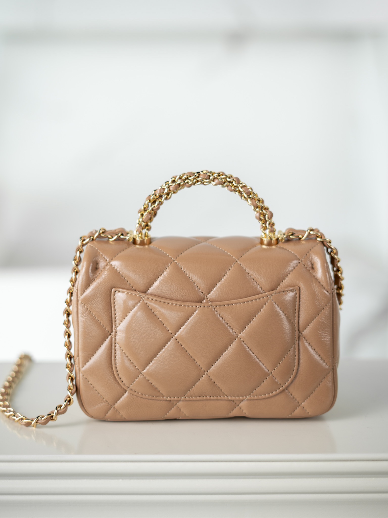 샤넬 핸들 장식 스몰 플랩백 골드 메탈 · 샤이니 램스킨 · 누드 (24B)